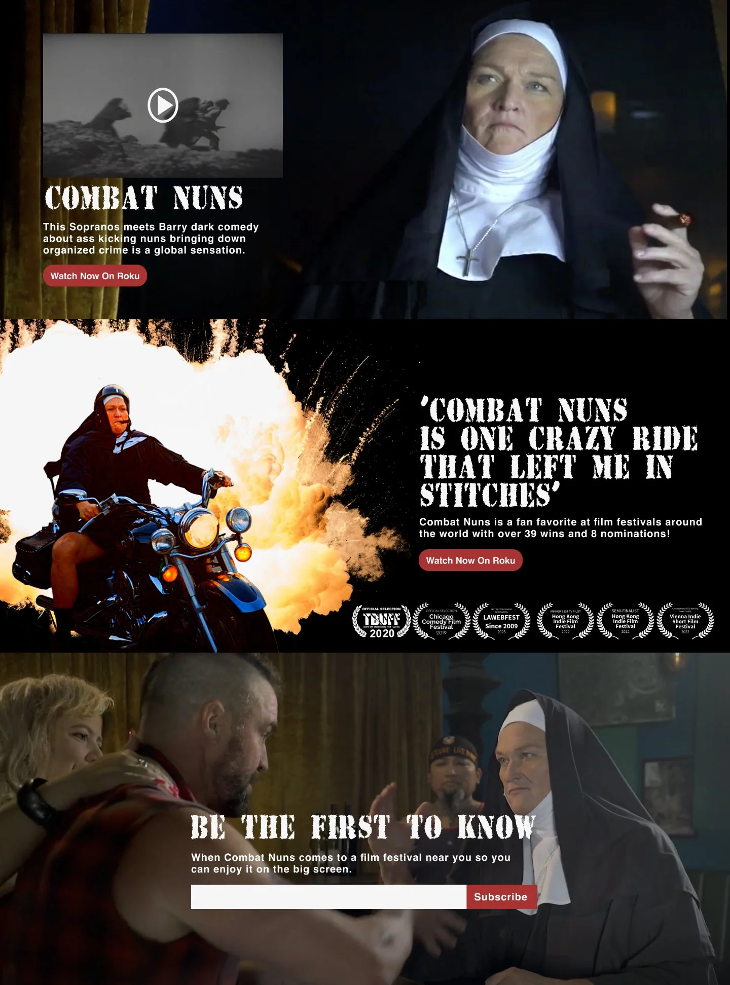 To promote the Roku stream link that was promoted via live stream on Instagram. Combat Nuns was available on Roku for a limited time for free for a promotional period. The landing page would promote the Roku link and encourage viewers to sign up for an emailing list to keep in contact with Black Triumph Productions for future screenings, updates, and live events.
